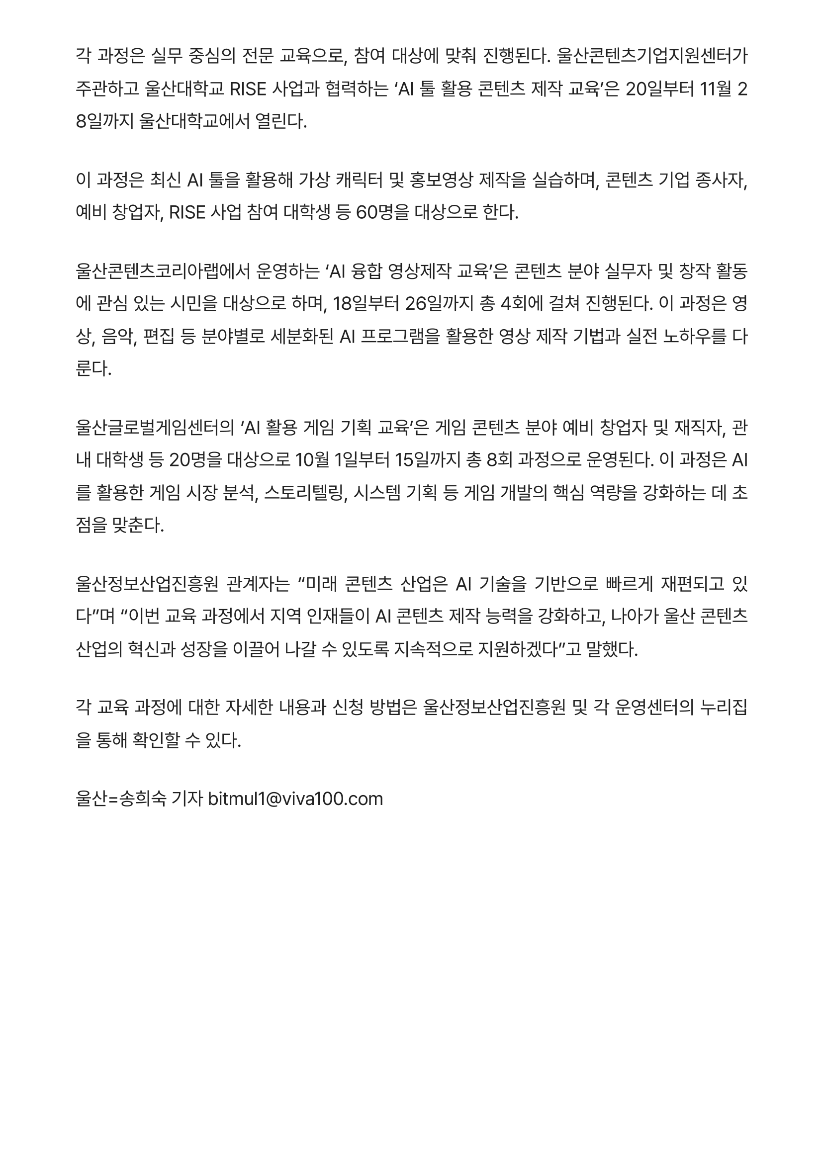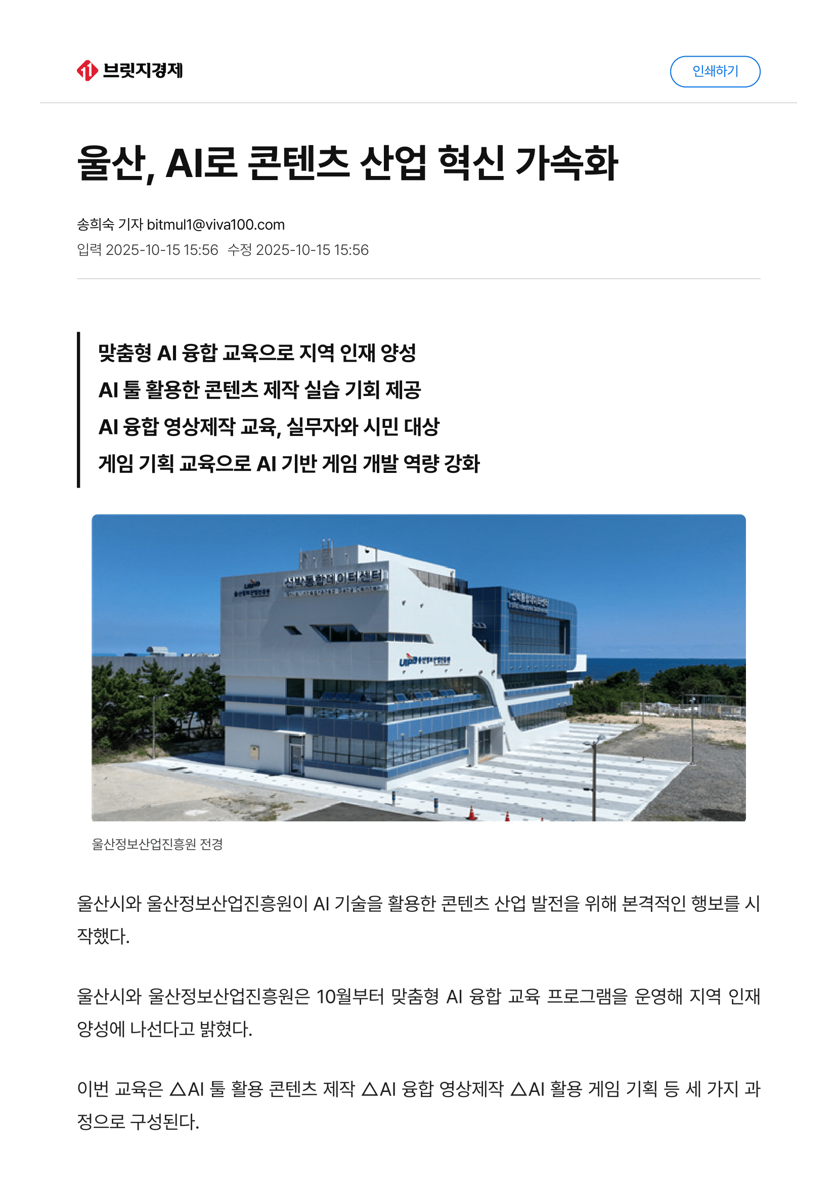 7 | [보도자료] 울산, AI로 콘텐츠 산업 혁신 가속화 | 관리자 | 2025-10-17 | 2 |