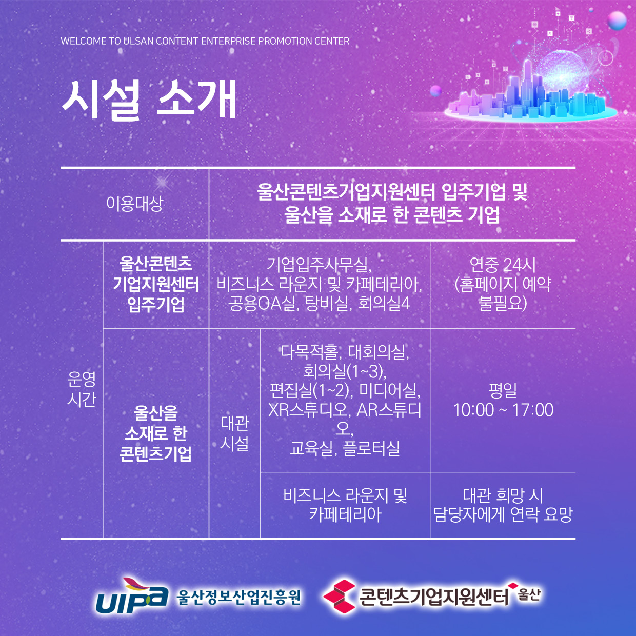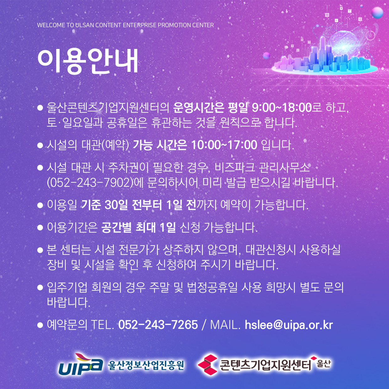 | 46 | [콘텐츠소식] 콘텐츠기업지원센터 시설 안내 | 관리자 | 2025-10-28 | 2 |