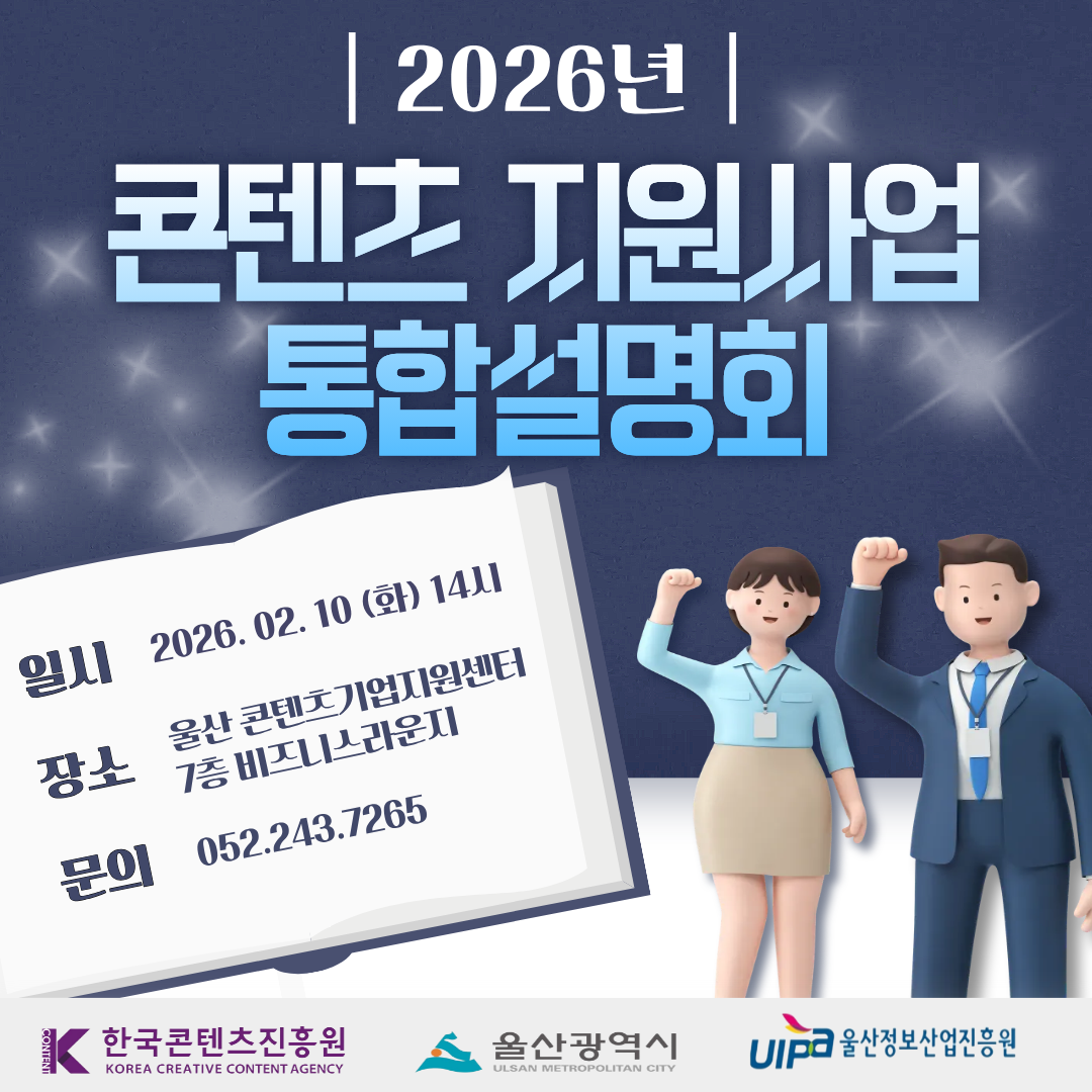 | 첨부파일 | 붙임1. 2026년 콘텐츠 지원사업 통합설명회 공고문.pdf 2026년 콘텐츠 지원사업 통합설명회 자료_콘텐츠융합사업단_최종(260210).pdf | ||